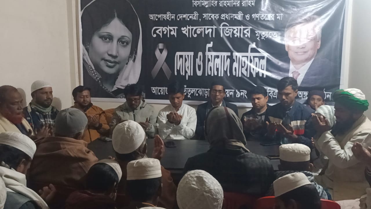 সাভার প্রতিনিধি : বিএনপির চেয়ারপার্সন সাবেক তিনবারের প্রধানমন্ত্রী মরহুমা বেগম খালেদা জিয়ার রুহের মাগফেরাত কামনা করে ঢাকার সাভারে দোয়া ও মিলাদ মাহফিল অনুষ্ঠিত হয়েছে। বৃহস্পতিবার(১জানুয়ারি) রাতে সাভারের তেঁতুলঝোড়া ইউনিয়নের ৯